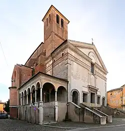 La iglesia suele denominarse templo de San Sebastián, como el templo Malatestiano de Rimini, erigido por el mismo arquitecto, con el mismo arco inscrito en la fachada.