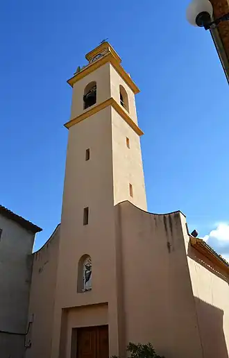El exterior es austero, destacando la torre campanario de 1964 de grandes dimensiones situado sobre el acceso.
