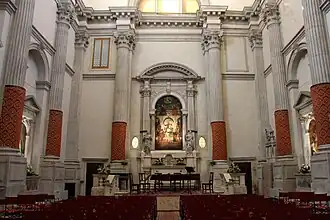 El altar mayor está situado en un lugar aislado en el centro del presbiterio y está flanqueado por dos estatuas de Antonio Gai que representan a La Fortezza y La Fede . Al fondo del presbiterio se encuentra el gran retablo San Vitale a caballo y Santi, también conocido como Gloria di San Vitale o Pala di San Vitale, realizado por Vittore Carpaccio en 1514 .