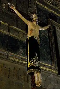 El Cristo se encuentra a los pies del coro bajo de la Iglesia de Sancti Espíritus. Es una talla de madera policromada, que remarca el sufrimiento de Cristo en la Cruz, que “correspondía al s. XIV” [16]. El cuerpo describe un movimiento en S con la cabeza inclinada a la izquierda. Se subrayan las huellas de la Pasión, insistiendo en el significado redentor. La imagen se adecua a modas y gustos modernos, como los postizos y el paño que la cofradía coloca en relación al tiempo litúrgico [16].