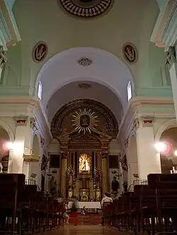 La nave central se cubre con bóveda de cañón, en esta nave se observa el retablo mayor del mismo estilo de la Iglesia, donde destaca una escultura de bulto redondo de Santa Bárbara, atribuida a Pedro Roldán, venerándose a ambos lados de esta los Sagrados Corazones de Jesús y María, titulares de la Hermandad de Jesús Sin Soga.