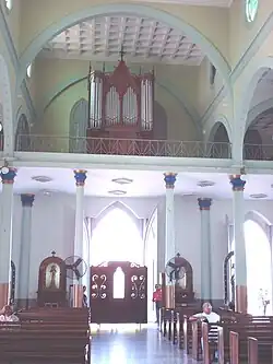 - Portada Principal: Compuesta por dos cuerpos, divididos en tres calles por pilastras de niveles decoradas con las figuras de arcos lobulados. En el primer cuerpo se abren tres puertas en madera de dos hojas, la central de mayor tamaño que las laterales, enmarcadas en arcos ojivales que se encuentran decorados por molduras y detalles propios del estilo. Sobre la puerta central se abren tres ventanas ojivales de madera, flanqueadas por molduras, y sobre ellas se encuentra un rosetón. Sobre las puertas laterales también se abren, otras dos ventanas del mismo estilo, de menor tamaño. La fachada culmina con la forma de un frontón triangular rebajado, con una sencilla cornisa, el cual está coronado por una estatua de su Santidad el Papa Pío IX, quien declaró el Dogma de la Inmaculada Concepción el 8 de diciembre de 1854; y sobre las pilastras, se levantan dos sencillas columnas. Cabe destacar que al lado de la puerta central se encuentra una placa de mármol con un soneto escrito en honor de la Purísima, por parte de Ildefonso Vásquez en 1865, la cual fue grabada por orden del ejecutivo del estado Zulia en 1940.