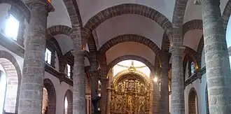 Es de planta rectangular (de salón), con falso crucero y tres naves separadas por columnas de orden toscano y arcos peraltados de medio punto y bóvedas esquifadas. El crucero se cubre con una cúpula semiesférica sobre pechinas.