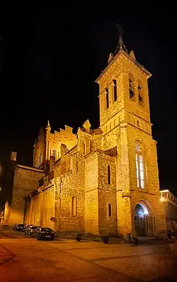 Es un edificio de planta de cruz latina, estructurada en tres naves, la central más alta, con una cabecera formada por tres ábside semicirculares y un transepto marcado. Las naves están cubiertas con bóvedas de cañón reforzadas por arcos torales. También encontramos todo de capillas laterales. Sobre el crucero se alza la torre cubierta con una cúpula esférica y los pies de la iglesia, el campanario, también una torre. El paramento es de piedras irregulares unidas con mortero. Destaca su exterior, de gustos historicistas, con arcos ciegos, bandas molduradas o la puerta de entrada, un arco de medio punto con arquivoltas soportadas por pequeñas columnas exentas.[1]