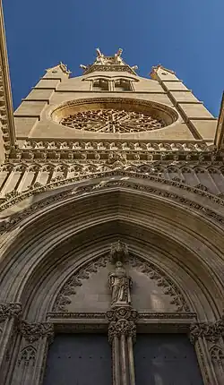 En el exterior, unas terrazas circundan el templo y muestran gárgolas con imágenes como dragones, arpías, basiliscos,... representativos del bestiario de la Edad Medieval.