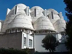 El uso del hormigón armado visto, un nuevo material en ese momento, permitió una construcción original en un estilo futurista, influenciada por el Art Nouveau. Ocho cúpulas elipsoidales soportan tres grandes cúpulas ovoides. En el interior, estas tres grandes cúpulas solo están soportadas por cuatro pilares, lo que permite un volumen interior sorprendente con bóvedas altas 25 m.[2] La forma angular de la flecha está en oposición con las fuertes curvas de las cúpulas. Originalmente, las cúpulas debían cubrirse con placas de cobre, pero no se colocaron por razones presupuestarias.