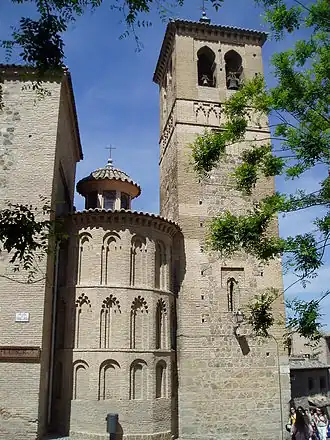 La parte mejor conservada de la construcción mudéjar es la torre, adosada al ábside del evangelio; lo que viene a confirmar que se levantó al mismo tiempo que la iglesia. Mantiene ese aire de alminar musulmán, que caracteriza a las torres toledanas: Cuerpo bajo cerrado, con aparejo de cajas de mampostería entre hiladas de ladrillo. Para iluminación de la escalera interior, se abren estrechas ventanas, casi saeteras, donde el habitual arco lobulado cobija un arquillo mixtilíneo, en yeso. Como remate, un friso de arcos ciegos lobulados, cuya clave se anuda en un círculo que enlaza con el alfiz, forma derivada de la decoración taifa. Encima, el cuerpo de campanas, con el consabido doble vano de herradura apuntada, y el alero sobre ladrillos en saledizo, transposición de los modillones de rollo califales. La estructura es la normal, de planta cuadrada, con machón central, en torno al que se desarrolla la escalera.