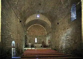 El interior presenta formas sobrias y decoración austera características de la arquitectura románica. La cubierta de la nave es de bóveda de cañón, y aparece ligeramente apuntada en los pies. Anteriormente debió de estar dividida en tres tramos por dos arcos fajones cuyos únicos restos son las pilastras sobre las que apoyaban. Fue reconstruida en el siglo XVI. El ábside está cubierto con bóveda de cuarto de esfera, denominada "de horno", realiza en piedra de color rojizo.