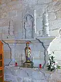 En ambos extremos del arco que conduce al altar sobresalen, a la izquierda y bajo un gran cuadro de la Divina Misericordia, una diminuta representación de la Piedad, y a la derecha, un retablo con policromía granate presidido, bajo un arco de medio punto y entre estípites dorados, por una gran escultura de San Miguel Arcángel bajo la cual se halla un relieve del Buen Pastor cargando la oveja perdida sobre sus hombros, resaltando en la zona superior altorrelieves monocromáticos de San Pedro y San Pablo. Próximas a la entrada del santuario se hallan dos pequeñas capillas: la de la derecha alberga una rudimentaria pila bautismal labrada en piedra, mostrando la de la izquierda un retablo policromado de dos niveles horizontales rematado por un ático en forma de arco escarzano con cuatro pilastras y una hornacina rectangular, presidido todo ello por una imagen de vestir de la Virgen del Rosario situada entre cuatro pilares salomónicos con rica ornamentación barroca de hojarasca y rematados por capiteles corintios bajo una moldura de la que parten las pilastras del ático. Destaca a su vez la sacristía del templo, con techo abovedado y una antigua pila bautismal con forma de concha, mientras que a la derecha de la puerta de entrada se ubica una escalera de caracol que conduce a la tribuna, la cual posee balaustrada de madera.