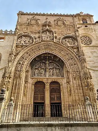 Posee una fachada gótico-isabelina construida por Simón de Colonia, Juan de Gumas, Juan de Nóveda y un familiar de este último, aunque se cree que el que la terminó fue un hijo de Simón de Colonia, Francisco de Colonia. Esta fachada de ha convertido en uno de los emblemas de Aranda de Duero. Fue iniciada antes del año 1500 y terminada por el 1515, siendo la mejor muestra del esplendor económico de la ciudad en esa época.[4] Es una obra del gótico tardía y cumple las funciones decorativa y teológica. La fachada tiene algunas zonas de los extremos cobijadas por un arco apuntado y el conjunto de la portada está coronado por una crestería. La figura central representa la escena del Calvario, esculpida en el hueco que deja una ampliación del arco exterior de la ojiva y a tamaño natural. A ambos lados del Calvario hay dos medallones que representan la Cruz a cuestas y la Resurrección del Señor, formados por baquetón de festón calado. Sobre ellos se sitúan dos escudos de Aranda en relieve. Y más arriba se hallan los escudos reales sostenidos por leones con águilas al lado. Entre los escudos arandinos y los reales están el yugo y las flechas, símbolos de la unión de Castilla y Aragón en Aranda de Duero. El arco de entrada es ojival, con festón calado. Hay una archivolta múltiple en la que hay labradas cardinas con animalitos fantásticos, que se alternan con dos órdenes de pequeñas capillitas de delicada filigrana en las que se representan un total de 28 santos y santas, algunos no identificados.