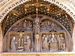 Las dos puertas que cierran los dos vanos formados por el parteluz son totalmente renacentistas y de madera de nogal. El parteluz posee en el frente una imagen de la virgen y sobre él se apoyan dos arcos rebajados que sostienen el tímpano, en el que hay cuatro escenas esculpidas en altorrelieve (en el sentido de las agujas del reloj, comenzando por la esquina superior izquierda): el anuncio del ángel a los pastores, cabalgata de los Reyes Magos, la adoración de los reyes a Jesús y el Nacimiento de Jesús.