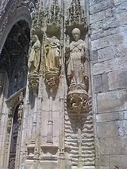La fachada está flanqueada por dos pináculos que poseen dos series de imágenes de santos, cubiertas en repisas apoyadas en repisas.