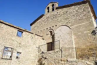 Es una iglesia de una sola nave con el presbiterio plano. Va cubierta por una bóveda de cañón apuntada que arranca de una imposta. La puerta de acceso originaria está ahora en desuso, pero se conserva en la parte de los pies del edificio, abierta en el muro del sur. Es de arco de medio punto y adintelada. No muestra ningún tipo de ornamentación y únicamente una moldura, a modo de guardapolvos, recorre la totalidad del arco por el exterior. En la misma fachada se ha conservado una ventana románica también de arco de medio punto y con una pequeña arquivolta en el interior. Tipológicamente recuerda la estructura de la portada románica en la iglesia de San Miguel de Forés. El material constructivo empleado en la totalidad del edificio es el sillar de piedra, cortado con cuidado y dispuesto en el muro con aparato isódomo.[2]