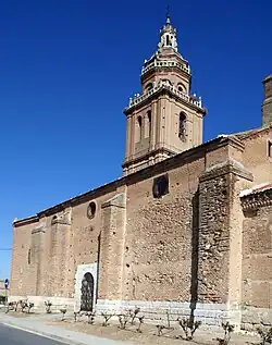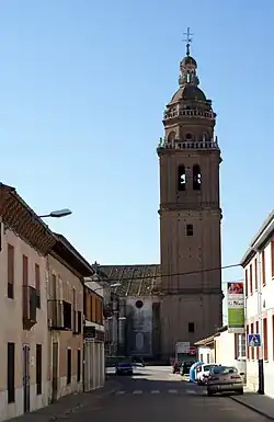 Anteriormente a la construcción en el siglo XVIII de la torre actual del templo, existía otra, citada ya en 1571.[17] Estaría situada, de manera exenta, a los pies de la nave de la Epístola, y fue calzada con cantería y reforzada en su cimentación hacia 1595 por Francisco de la Maza. Se concluyó en 1602, de mano de Toribio de la Cruz, y, realizada en ladrillo, se remató con un chapitel.