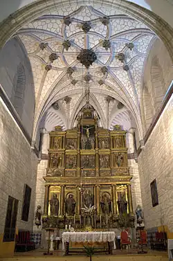 La cabecera es la parte más antigua del templo; tiene planta rectangular y la parte del presbiterio está cubierta con una bóveda de crucería estrellada, apoyada sobre trompas sustentadas en columnas, y cuyos nervios combados forman una cruz con los lados en forma conopial, rodeando un círculo central. Las claves en que culminan los nervios en la bóveda están ricamente decoradas con motivos vegetales y volutas, con una disposición conocida como “a candelieri”, que aportan un ornamento renacentista al conjunto. El estilo gótico tardío en que está realizada la cabecera es considerado por algunos autores como uno de los mejores ejemplos del gótico en la provincia de Valladolid.[19] Tal abovedamiento corresponde a la segunda etapa de la construcción de dicha capilla mayor, donde trabajó primero Diego de Segovia, y posteriormente Juan de Escalante, cuyo trabajo en el cubrimiento es similar al realizado en la iglesia de Santovenia de Pisuerga.