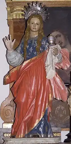 - Altar del Niño: presidido por un Niño Jesús de madera que se asienta sobre el que pudiera ser el sagrario primitivo de la iglesia. El altar se decora con siete cuadros de comienzos del siglo XVII, en los que aparecen San Cristóbal, San Juan Bautista, San Joaquín y la Virgen Niña, Santa Apolonia (muela), Santa Bárbara (torre), Santa Águeda (pechos) y Santa Lucía (ojos).[25]