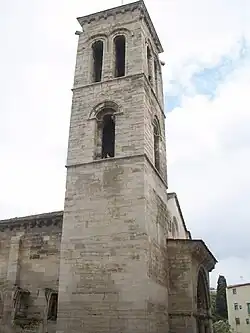 En el lado norte de la iglesia y a la izquierda de la puerta principal, se encuentra la torre románica exenta menos por un lado del cuerpo de la iglesia, no muy alta, y con tres cuerpos de planta cuadrada.