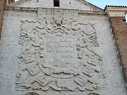 La majestuosa fachada de los pies presenta un gran rectángulo de piedra y está presidida por el descomunal escudo de estilo renacentista del patrón, que deja evidencia de su identidad, de su patronazgo, y así asegura su paso a la posteridad. Es el escudo esculpido en piedra más grande del mundo. En la parte inferior, la fachada lleva dos puertas gemelas de medio punto y al lado del evangelio se levanta una torre de planta cuadrada con un cuerpo superior de campanas, torre que fue reconstruida en la década de 1940, respetando totalmente su fisonomía original, ya que se hundió en 1938 debido al mal estado de sus fábricas.