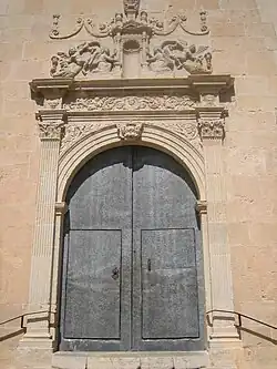 La portada principal, a los pies de la iglesia, tiene apertura de medio punto con el escudo de la villa en la clave, y en las enjutas, dos medallones con las cabezas de San Pedro y San Pablo, todo enmarcado por pilastras estriadas con capitel corintio, que soportan un entablamento con arquitrabe y cornisa moldurados y, el friso con la cara de Apolo rodeado de espumillones y dos putti, y grotescos en los extremos que representan la noche y el día. Por encima, hornacina en forma de pechina protegida por columnas con el fuste acanalado, ángeles rezando y querubines cabalgando sobre delfines, y en el techo, un frontón coronado por el escudo de la villa y flanqueado por grifos y cintas decorativas, formando un tipo de dosel.[12]