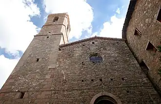 Iglesia situada en el centro histórico de la ciudad. Es de planta basilical cubierta a dos aguas con teja árabe. Tiene tres naves, con un presbiterio rectangular, una capilla y sacristía. Las naves laterales son bastante estrechas, y habían cobijado antiguas capillas. El campanario, de sección cuadrada, está a los pies del recinto y lo remata una barandilla de piedra. El edificio es una construcción de piedra y cal, que aunque conserva elementos de la época románica como es el de la puerta de forja, situada a mediodía, es una obra, principalmente, de finales del siglo XVII y de todo el siglo XVIII. La puerta de entrada actual, a poniente, es de época románica con las puertas hechas de madera con herrajes de hierro forjado. En cuanto al interior, cabe destacar sus decoraciones pictóricas de la segunda mitad del siglo XX.[1][2]