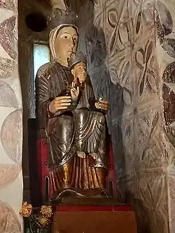 En el centro de la bóveda del ábside en una mandorla se representa la imagen de Magestas Domini y el tetramorfos de los evangelistas -aunque solo se conserva la representación de Mateo (un hombre) y Marcos (un toro)- . En la parte inferior del ábside la pintura representa una arquería, con doce arcos angulares e intradós lobulado bajo los correspondientes frontones; en esos arcos debieron representarse los doce apóstoles, seis a cada lado de una hornacina central. con una copia de la imagen de la Virgen cuyo original, de hacia 1200, se conservó durante un tiempo en el palacio cabo de armería de este lugar,[5] y actualmente en el museo diocesano.[6]