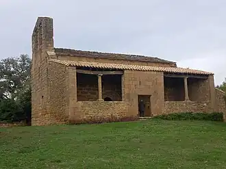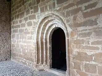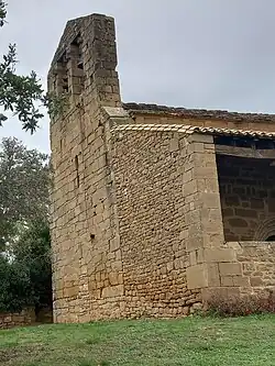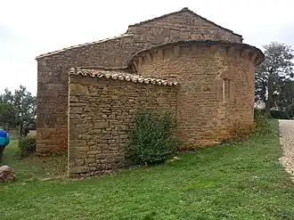 En los pies del templo se abrió una puerta-actualmente cegadas. de dimensiones reducidas con arco de medio punto; otra puerta, también cegada se abría en el muro norte del templo. Actualmente los muros exteriores solo presentan tres huecos, dos de ellos en el ábside; una saetera en el eje central, y otro hueco rectangular sobre la sacristía; otra saetera aparece en el eje del muro oeste. En la construcción del templo se han utilizado algunos restos de construcciones anteriores; destaca en el muro sur, junto a los pies de la nave un piedra sepulcral con una inscripción latina bien conservada; en el ara del altar se utilizó una piedra, también romana, de sacrificios al "Sol invicto".[3]