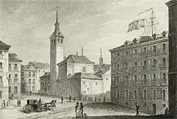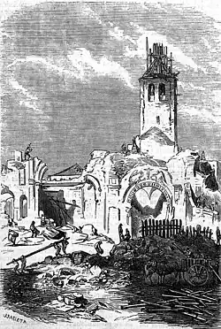 ![]() Fachada sur (calle Mayor) de la iglesia en 1869, durante los trabajos de demolición. Han desaparecido la cúpula y gran parte de las cubiertas. Se aprecia la fachada neoclásica de Ventura Rodríguez. Nótese la estrechez de la calle Mayor en este punto, apreciable por la sombra proyectada del palacio de Uceda. | ||