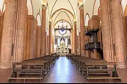 El interior se caracteriza por una penumbra inspiradora, y es de planta de cruz latina con una nave y numerosas capillas laterales con frescos y pinturas[2]. Los más importantes son: