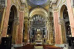 En el interior, la iglesia tiene planta de cruz latina, con una sola nave flanqueada por tres capillas a cada lado. El suelo, rico en lápidas, aparece en la renovación terminada en 1739.