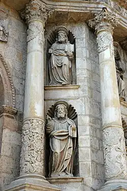 La fachada principal está situada en un lateral de la iglesia, es de estilo barroco con influencias renacentistas del siglo XVII. En la base salen dos leones y las columnas son de estilo corintio. Consta de tres niveles: a cada lado de la puerta están las imágenes de cuatro apóstoles (aunque muy deteriorados), justo encima de la puerta principal de acceso al templo hay una imagen de la Virgen María custodiada por dos ángeles y por encima aparecen los cuatro apóstoles restantes y una imagen de Dios.