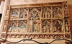 - El retablo de San Bernardo y San Bernabé, de piedra policromada con escenas de la vida de los santos, del siglo XIV