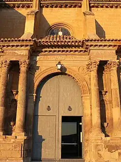 La puerta principal o del lado sur es de estilo renacentista, con una traza de tipo arco de triunfo, con un arco de medio punto sobre columnas de orden corintio, con hornacinas entre las mismas. Sobre el arco hay una gran cornisa en la que se lee la inscripción "Beligero Hispania Patrono Sacrum, 1573". Sobre los lados del arco hay dos medallones con los bustos de San Pedro y San Pablo.