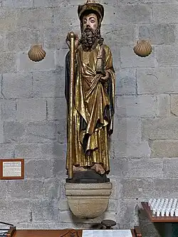 En el muro opuesto, otra magnífica imagen gótica del siglo XIV, de estilo similar, representa a san Bartolomé. Realizada en piedra policromada, a excepción de la mano derecha y el cuchillo, que han sido repuestos en madera, su posición es más dinámica que la de Santiago, ya que avanza con la rodilla moviendo el manto hacia adelante y enriqueciendo las líneas del contorno. Excelente es también el tratamiento dado al rostro con cejas arqueadas, ojos almendrados y boca entreabierta. La barba, separada del cuello, está tratada con gran detallismo y formada por trazos sinuosos.