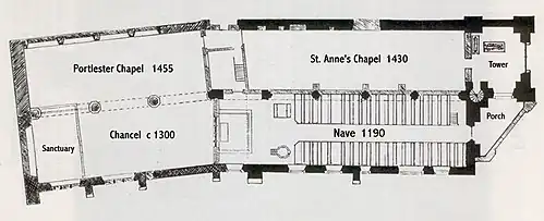 Durante las excavaciones en el siglo XIX se encontró una fuente anglo-normanda que data del siglo XII y ahora se exhibe en la iglesia.