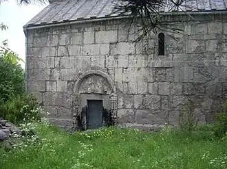 En la fachada occidental, la parte superior (con ventanas) presenta huellas de haber sido remodelada, pero la entrada sigue siendo la antigua. Su rica decoración es un ejemplo muy importante del arte del siglo X: encima de la entrada hay una enorme piedra rectangular en la que están esculpidos dos jinetes uno frente al otro (probablemente San Jorge y San Demetrio). Sobre esta piedra hay arcos concéntricos de talla, el marco general de la entrada es un arco labrado que descansa sobre columnas de pared. Toda esta decoración compleja y diversa, en su forma general, con la relación de partes individuales, con la selección de tallas y esculturas, fue pensada magistralmente por los arquitectos.