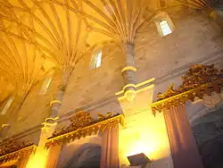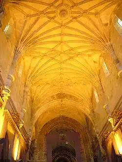 En la actualidad esta única nave que hace recordar el modelo llamada iglesia de salón ( Hallenkirche ) está cubierta por una bóveda compleja de crucería concluida a mediados del siglo XVII, probablemente en 1638. Las capillas laterales se terminaron en 1658. En estas obras se mantuvo el espíritu del siglo XVI al establecer un espacio amplio, adecuado para albergar un gran auditorio, conservando muchas de las características del presbiterio, del transepto y del portal manuelino, además de sus propias dimensiones.[2]