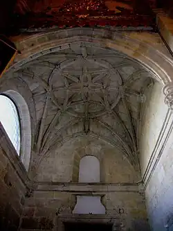 Se mantiene el material, granito porfiroide, así como el esquema de cuatro ventanas recortadas en cada lado en la zona superior de las paredes de la nave, incluso sin elementos decorativos, tanto en el interior como en el exterior así como un friso continuo, aunque más discreto, donde arrancan diez ménsulas con vigas prismáticas de once nervios que se cruzan en forma virtuosa en la bóveda. En este aspecto típicamente eenacentista —fuera de la época— se une la decoración de los ocho arcos de medio punto de las capillas laterales que se asemejan en su estilo a los aspectos típicos de finales de la Edad Media, con basas mixtilíneas invertidas, rosas, elementos vegetales, vides, racimos de uva, niños desnudos en posiciones extrañas, monos y lo que se piensa que es un conejo tocando la gaita. Las ventanas de las capillas fueron tapiadas el siglo siguiente para instalar los retablos barrocos. Las bóvedas de las capillas están también formada por bóvedas de crucería con una rosa bien concreta en el centro del plano definido por una cruz perfectamente simétrica, con cuatro llaves, talladas con elementos vegetales, que marcan los extremos de la cruz.[2]