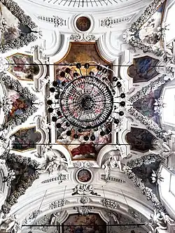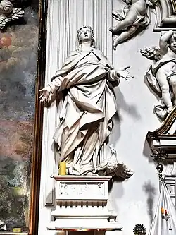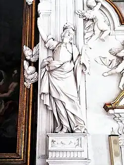 - Nicho delimitado por un tímpano de arco quebrado con un teatro oval intermedio rematado por el fresco Éxtasis de Santa Teresa.