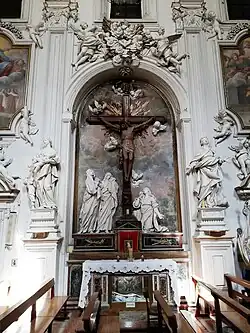 Capilla del Santo Crucifijo. En el altar se encuentra el Crucifijo del siglo XVIII con cruz de carey y figuras de estuco de santos dolientes: María, María Magdalena y San Juan Evangelista, bordeados por las alegorías de la Caridad, la Misericordia, la Fortaleza y la Divina Sabiduría. Delante del sagrario, el busto de madera de Sant'Alberto degli Abati de escuela napolitana. Debajo de la mesa el simulacro de cera que representa la Dormitio Virginis.