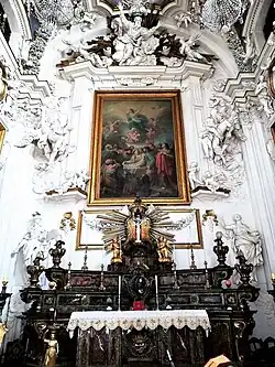 Presbiterio con ábside rectangular delimitado por arco de triunfo. El altar mayor ad Deum en piedras duras y semipreciosas, ágata y lapislázuli tiene dos escalones con jarrones laterales y dos estatuas de estuco: la Fe y la Caridad de Procopio Serpotta. En el edículo de la parte elevada destaca la pintura de ' Asunción de Giuseppe Patricolo de 1800, en la cornisa del luneto del arco absidial se encuentra la Gloria del Padre, obra en estuco de Giuseppe y Procopio Serpotta. La bóveda alberga un fresco que representa a Santa Teresa venerando a la Virgen Coronada. Sobre la mesa del sagrario está coronada por la figura de Jesús resucitado rodeado de rayos de luz.