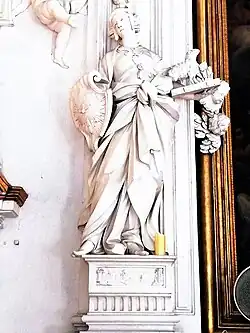 - Nicho delimitado por un tímpano de arco quebrado con un teatro oval intermedio rematado por un fresco. Cerca del arco triunfal se encuentra la estatua de madera de Santa Rosalía.