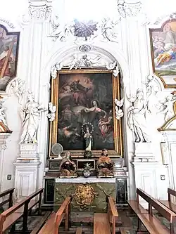 Capilla de Santa Teresa de Ávila. En el altar, la pintura que representa a Santa Teresa indica el monasterio de San Giuseppe de Gaspare Serenari, bordeado por las alegorías en estuco de la Divina Sabiduría y la Fortaleza. Sobre la mesa se coloca una estatuilla de madera policromada del siglo XVIII que representa a la Inmaculada Concepción. Frente al sagrario del altar, los bustos de madera policromada de Santa Teresa de Ávila y San Juan de la Cruz, de escuela napolitana.
