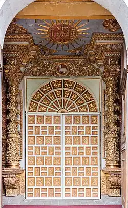 Los nichos contienen figuras de los santos fundadores de las comunidades religiosas como San Francisco de Asís, Santo Domingo de Guzmán, San Agustín, San Luis Gonzaga, Santa Mariana de Jesús y San Ignacio de Loyola. En la parte alta lo adorna una corona simbólica de la Iglesia católica, con la composición escultórica del Espíritu Santo, Dios Padre, Dios Hijo, así como las figuras de la Virgen María, San José y la Santísima Trinidad. Todo forma un solo conjunto escultórico donde se juntan lo divino y lo terreno, atribuido a Severo Carrión (excepto el Niño Jesús, tallado por José Yépez).[2]