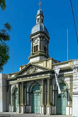 De estilo neoclásico y neorrenacentista, su fachada está compuesta de un cuerpo afrontonado que se apoya en seis columnas corintias, con los ingresos rematados por arcos de medio punto.[5]