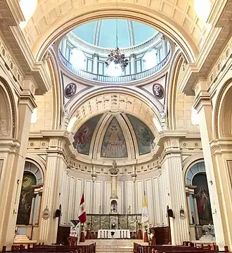 El techo es de dos aguas, que se divide de acuerdo a la planta de Cruz latina, luego se halla la gran cúpula de 40 metros de diámetro, cuenta con pequeñas columnas dóricas y los bellos vitrales, está revestida de una especie de mármol decorada con formas cuadrangulares de colores blanco y celeste. Sobre ella otra cúpula más pequeña coronada por una Cruz de acero. Finalmente la bóveda, al igual que la cúpula está revestida de mármol con las decoraciones cuadrangulares. El Atrio cuenta con el piso hecho de piedra y a ambos lados se encuentran dos pequeñas piletas de mármol blanco.