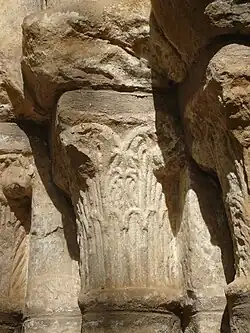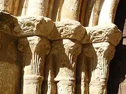 La portada se sitúa en el muro sur del edificio y constituye un claro ejemplo de la sobriedad característica del románico. Se compone de cuatro arquivoltas lisas: tres reposan sobre columnas acodilladas, mientras que la exterior se apoya directamente en jambas de sección prismática. Los capiteles, de formas alargadas y labra minuciosa, están decorados con motivos vegetales, predominando las hojas de acanto, semejantes a las que pueden observarse en iglesias cercanas, como Carabias o Saúca. Sobre estos se disponen cimacios decorados con una banda vegetal, de la que brotan hojas dispuestas en grupos de tres. Todo el conjunto queda enmarcado por una chambrana de perfil nacelado que refuerza la unidad formal de la portada.