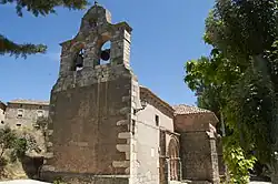 La iglesia está coronada en el hastial oeste por una espadaña barroca de finales del siglo XVIII o principios del XIX. Se trata de una estructura de sillería con dos cuerpos: el inferior con dos troneras para campanas y el superior con un pequeño vano para el campanil, flanqueado por pináculos con esferas.