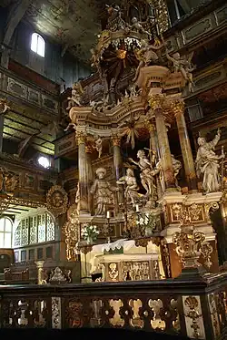Las familias más privilegiadas tenían sus propios palcos en la iglesia. Frente al púlpito, sobre la entrada principal de la iglesia, hay un hermoso palco de la familia Hochberg, benefactora de la iglesia, ricamente decorada, construida en 1698. El palco fue creado como muestra de agradecimiento a la familia del conde Johann Heinrich von Hochberg, que fundó los robles para la construcción de la iglesia.