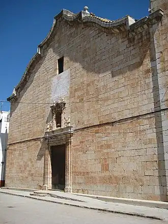 La fachada principal, a los pies de la iglesia, tiene perfil mixtilíneo, y puerta adosada la torre campanario junto a la Epístola. Este frontis está centrado en una sencilla portada, con apertura de arco de dintel y perímetro moldurado, protegida por pilastras dóricas que soportan un Entablamento, y por arriba, una hornacina apechinada con la imagen del patrón de la población, Sant Blas, enmarcada por pilastras y cubierta por una cornisa mixtilínea. Encima un reloj de sol del siglo XIX, y por sobre, una ventana.[3]