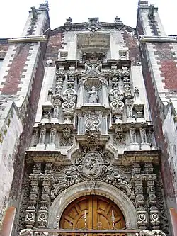 La portada principal es de estilo churrigueresco trabajado en chiluca, una piedra gris dura y flanqueado por dos pilares.[6] La clave del arco central de esta entrada está decorada con un medallón con el escudo papal cubierto por una serie de volutas. Sobre esto, hay un relieve que representa a la Santísima Trinidad con Dios Padre con vestidura papal.[5] La representación de la Trinidad se debe al patrocinio de la iglesia por una hermandad trinitaria originalmente formada por sastres.